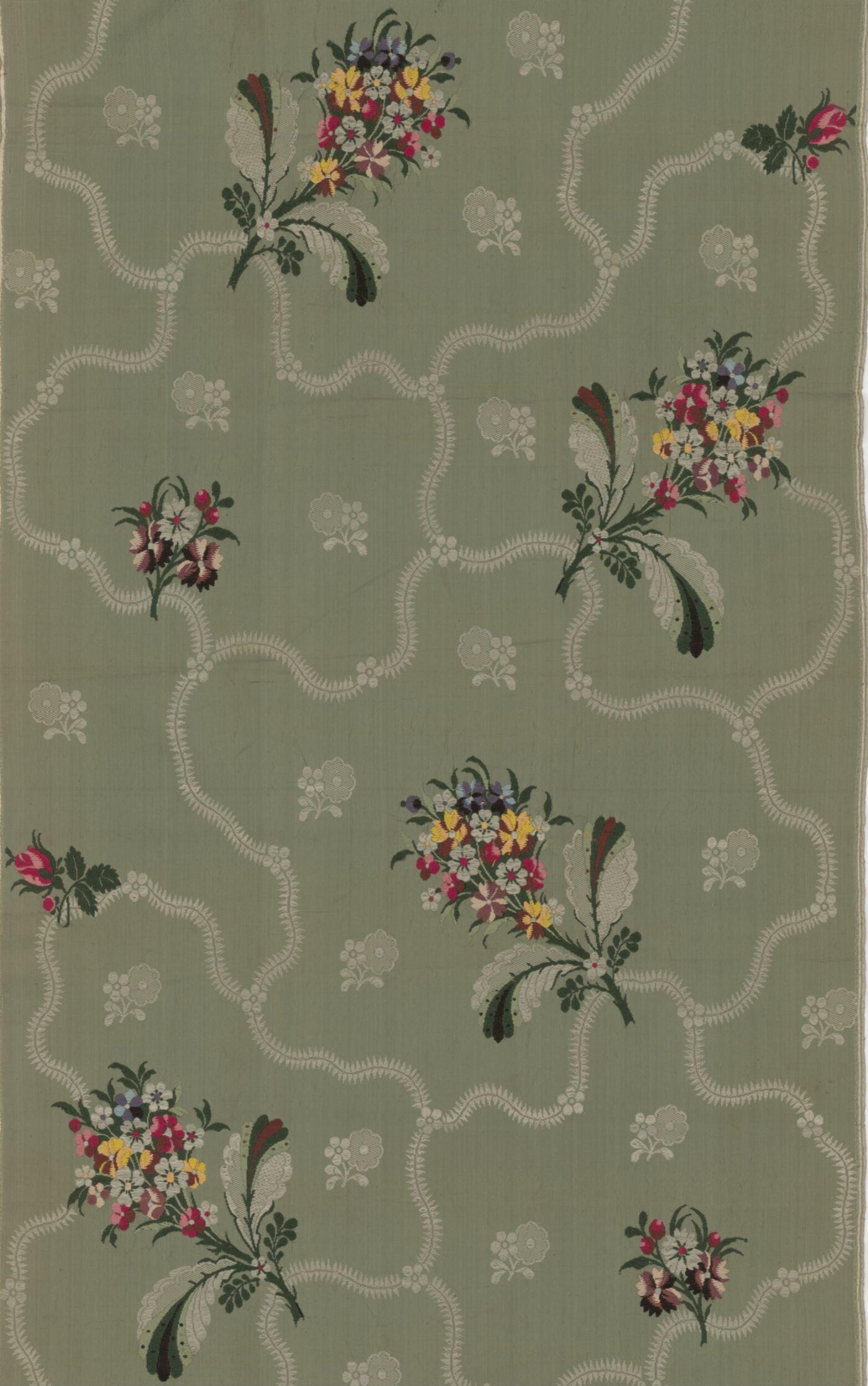 Lustestring – is another fabric that did not appear on either Wikipedia or the silk society’s list and the link is to an item in the Victoria and Albert Museum who have wonderful collections of fabric and fashions throughout the ages. The fabric below is described as “This delicate silk is from a dress said to have belonged to Queen Charlotte, wife of King George III, although this association cannot be proved. Charlotte was seventeen at the time of her marriage to the King in 1761, which was around the time when the silk was woven. It is a lustring, or lutestring, a lightweight silk with a glossy surface.”