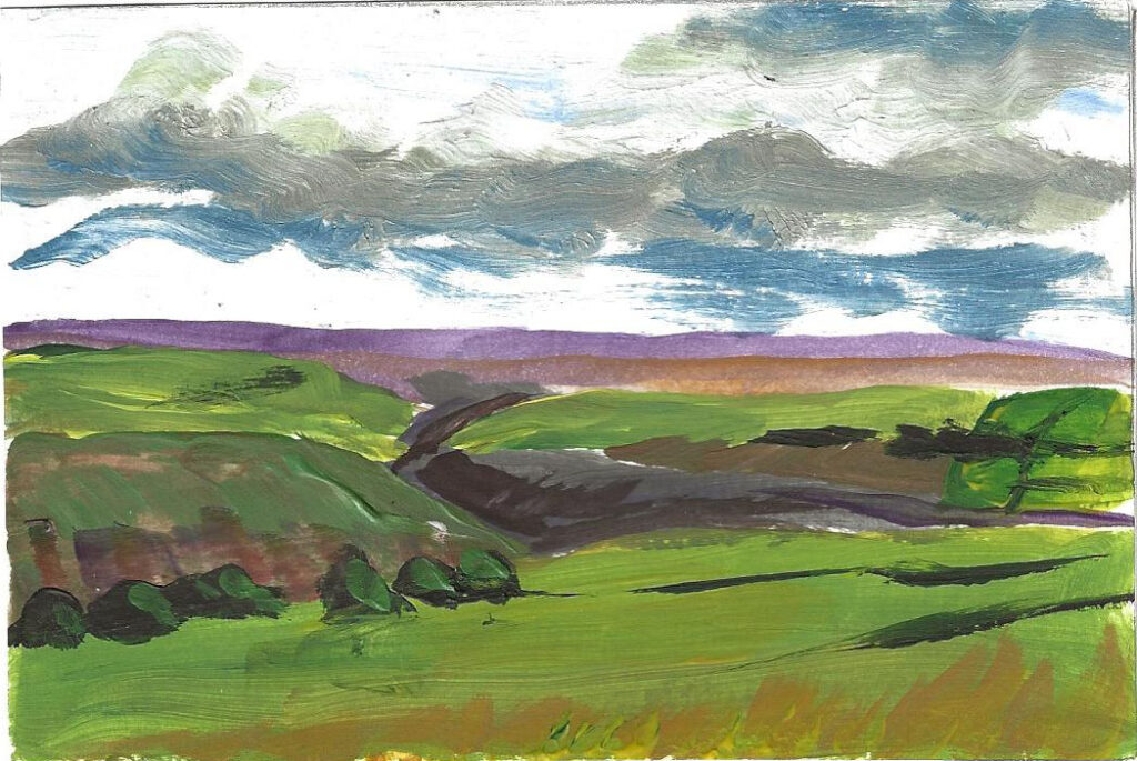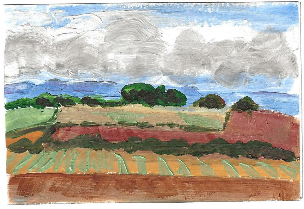 6 – There is but one Painting/Poetry Postcard to go after this – I am replying to the “bonus” cards sent by participants to the International list (as opposed to the majority US lists) of which five included their names and addresses and so though, under the terms of the PoPoFest, one is not obliged to reply – these guys were obviously hoping for one – in fact one was on my list in 2023 – so I decided to press on with the paintings. I was particularly pleased with these two which are acrylic on paper, because I achieved the sort of looseness of touch that I seek but don’t always find – this may be a result of doing 35 paintings in about 5 weeks…