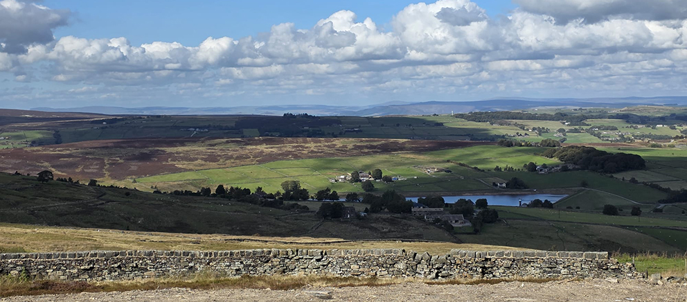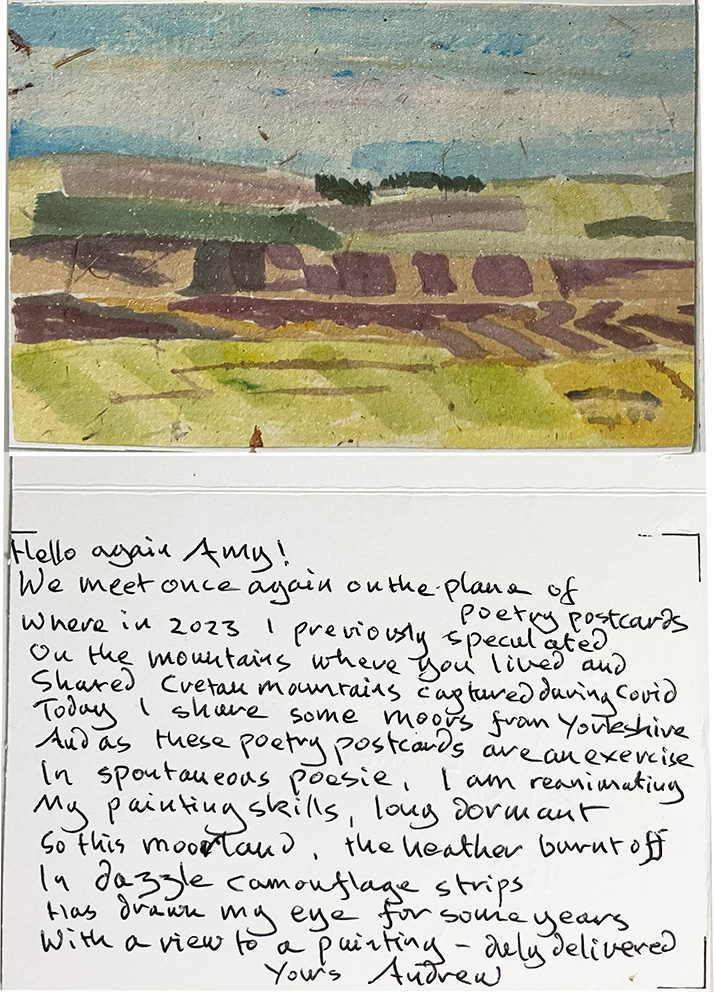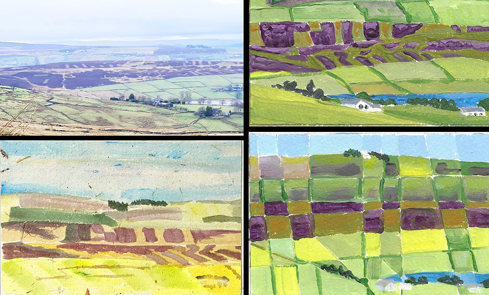 10 – Back at work again, after a couple of days working at home with a cold, on Thursday, I had to take samples for microbiological testing, over to the labs at Luddenden Foot, and driving back home across the moors, I stopped to photograph this particular landscape, which fascinates me. At the centre you can see strips where the heather has been burned off to let the grass grow through for the sheep, creating a linear pattern at odds with nature. I painted this scene several times for the Postcard Poetry Festival and this day, the clouds were scudding across, throwing different parts of the view into shadow…