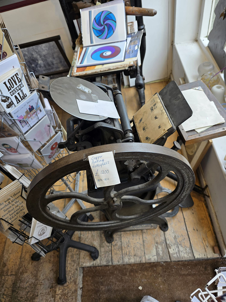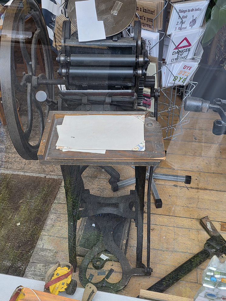 7 – The sheep is outside a craft/gallery/antique shop and in the window, was this treadle printing machine which took me back to school where we used a somewhat bigger treadle Heidelberg machine to print school event programmes. This one is still used by the proprietor for a similar purpose.