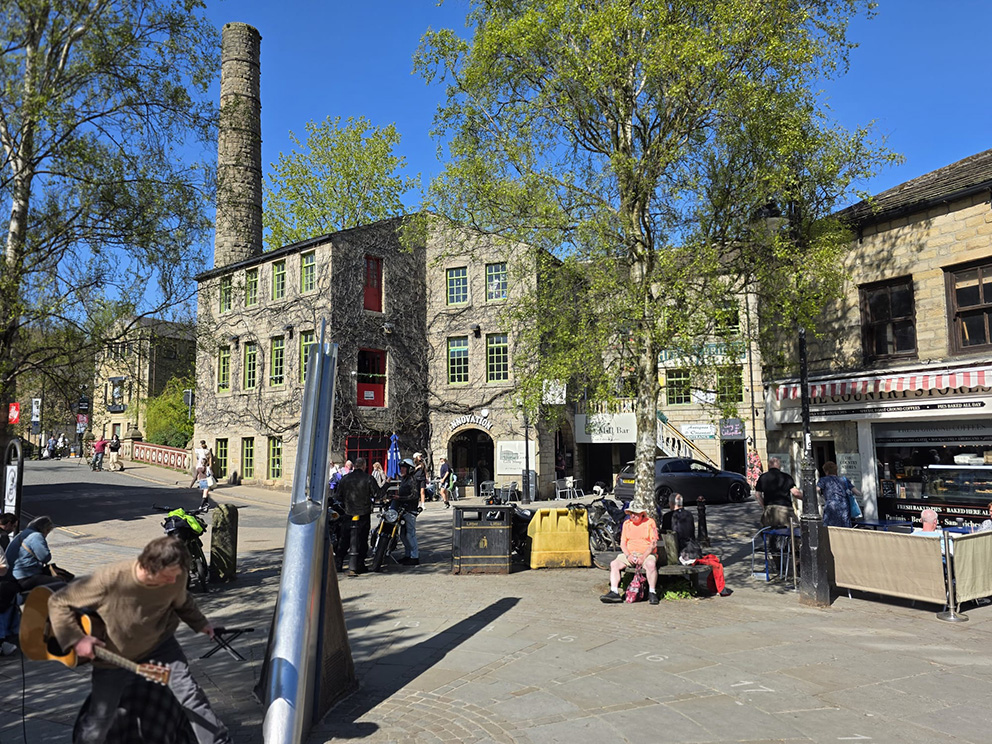 The central square of Hebden Bridge showing the Bridge Mill – a watermill that dates back to 1314. In the foreground is a sculpture in the form of a giant weaver’s shuttle.