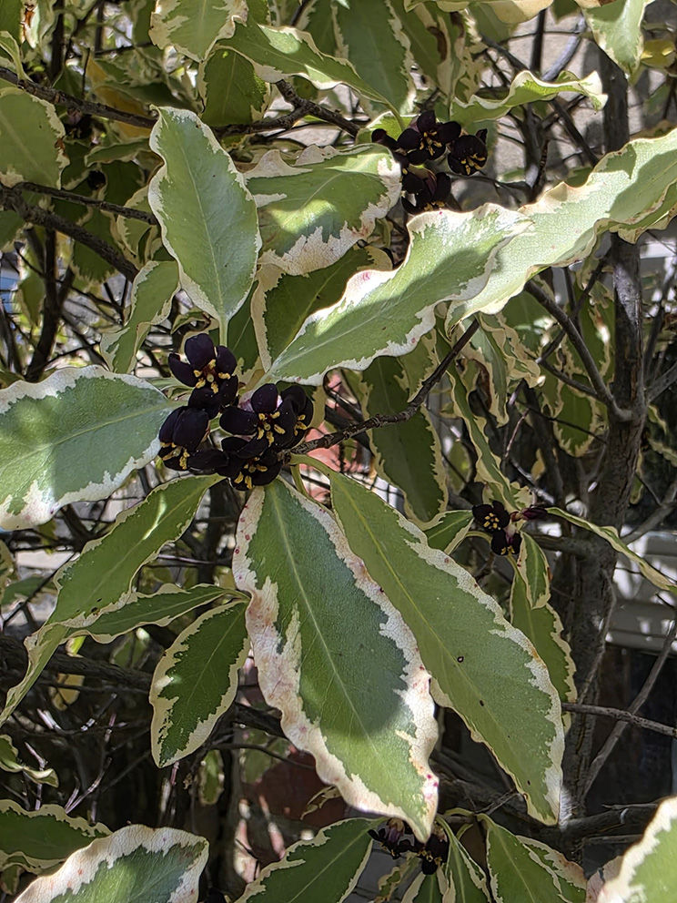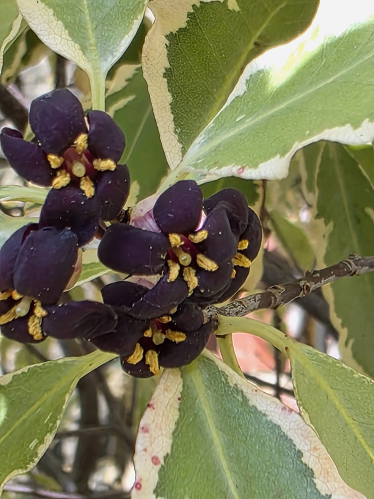 5 – And talking of black flowers, the Variegated Pittisporum is in flower with its strange, tiny black flowers…
