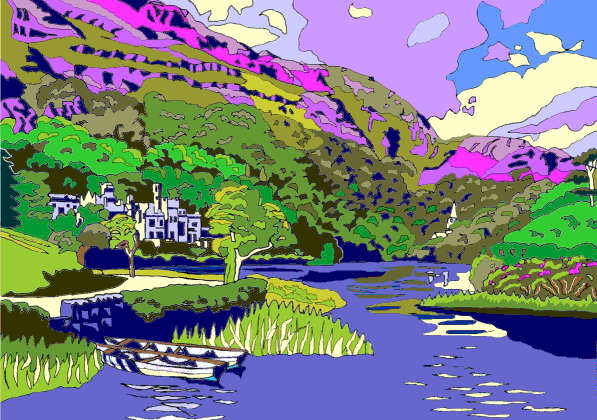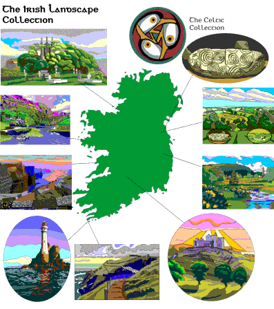 On a smaller scale still, Needlepoint Tapestry kits have been popular for a long time, consisting of a screen-printed canvas which the crafter stitches over in wool or cotton yarns to produce the picture. Screen-printing means producing the whole run of canvasses at one go, because a different screen is required for each colour and to store the screens would be prohibitive in terms of both cost and space. A new possibilty came along with heat-transfer printing, where a design is printed onto special paper and then heat-pressed onto the canvas. I started a business in the early ’90’s whilst living in Ireland, offering iconic Irish landscapes.