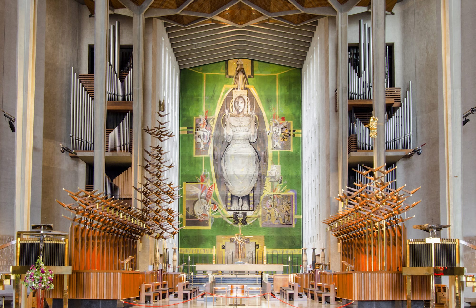 A modern, large-scale tapestry (below) is by artist Graham Sutherland for the new Coventry Cathedral – the old cathedral having been destroyed during WW2. You can read the story of Sutherland’s tapestry here.
